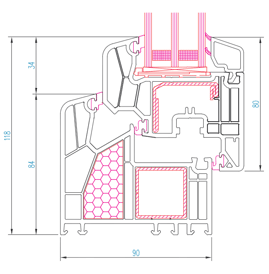 90-mm-System mit 6-Kammer-Geometrie. Verglasungen von 24 bis 50 mm Glasdicke möglich. Hervorragende Wärmedammwerte werden bereits beim Einsatz von 24-mm-Verglasungen erzielt. Dämmwerte von bis zu Uw = 0,8 W/m2K bei Einsatz von Dreifachisolierverglasung und Dämmkeil. Wanddicke im höchsten Qualitatsstandard nach RAL "Klasse A" (DIN EN 12608). Mitteldichtungs-System mit 3 Dichtungsebenen fur verbesserten Schallschutz, höhere Dichtigkeit und effektivere Wärmedämmung. Werkseitig einextrudierte, verschweisbare Dichtungen in Schwarz oder Grau. Gleiche Verstärkungen wie bei allen 70-mm-Profilen sorgen für statische Sicherheit und dauerhafte Funktion. Schlankes Design sorgt für die klassische SOFTLINE Optik mit ausgewogenen Proportionen bei schmaler Ansichtsbreite von 118 mm. Beschlagmontage in Flügel und Blendrahmen durch mehrere Wandungen. Zusätzliche Verschraubungen der tragenden Beschlagteile in Stahlarmierung möglich. Gleicher Einsatz von Beschlägen und Schliesstücken wie bei den VEKA 70-mm-Systemen. Erhältlich ist eine Vielzahl von kompatiblen Anschluss- und Kopplungsmöglichkeiten aus dem 70-mm-Systemportfolio wie z. B. Fensterbankanschlussprofile. Beschlag: